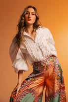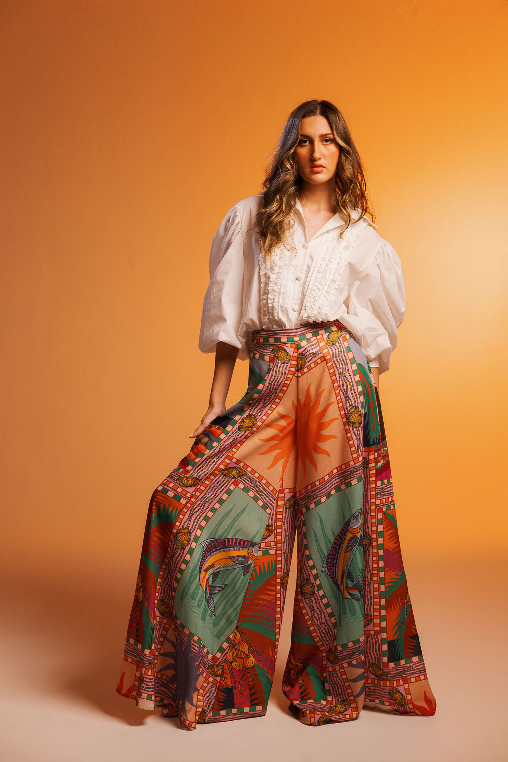 Pantalón amplio con estampado tropical inspirado en la iconografía del Caribe panameño. Su silueta fluida y cintura marcada lo convierten en una pieza protagonista para llevar con tops neutros o blusas románticas.