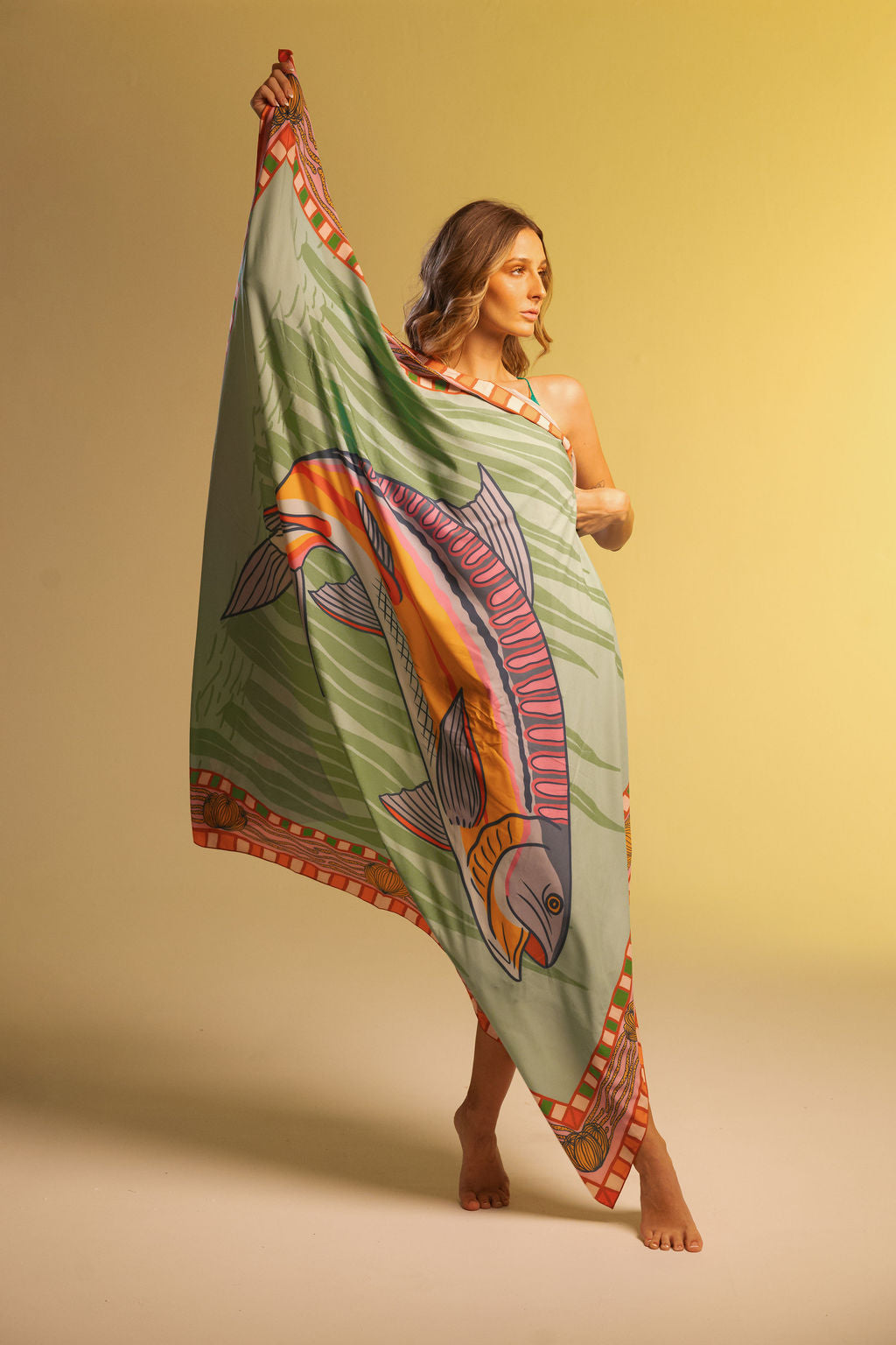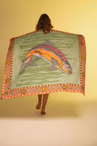 Un pareo inspirado en los reflejos del mar y la majestuosidad del sábalo. Su estampado central evoca movimiento, libertad y conexión con la vida marina. Llévalo como pareo, foulard o top. Hecho en tela suave, fresca y versátil, ideal para tus días bajo el sol.
