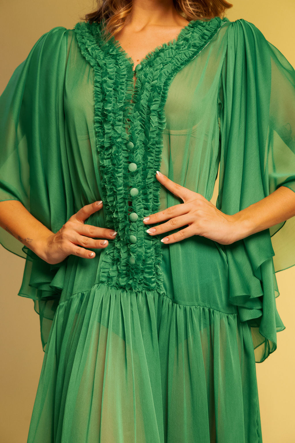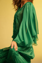 A flowing dress with a tropical feel. The Pipa Maxi Dress is crafted from lightweight chiffon, with a fluid silhouette that embraces the body's movement. Vertical ruching details at the bust and on each level of the skirt make it both sophisticated and comfortable.