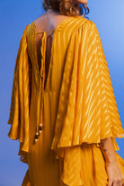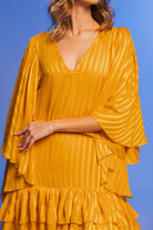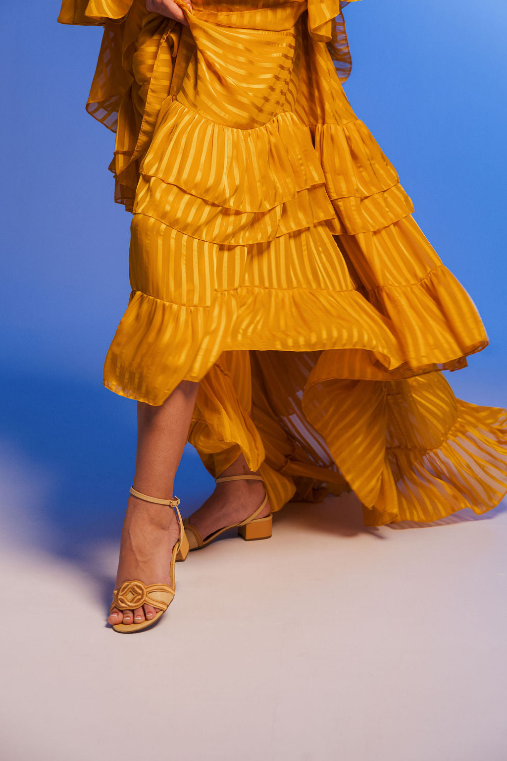 Flowy maxi dress in mustard yellow with ruffles and a satin texture, perfect for warm weather and special occasions.