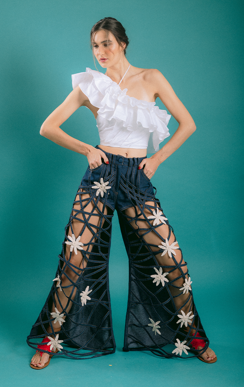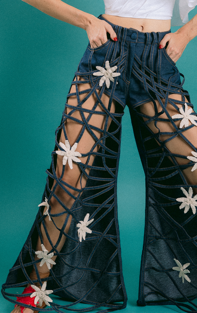 Jeans de bota amplia, parte delantera confeccionada a partir de tiras y apliques bordados en croché